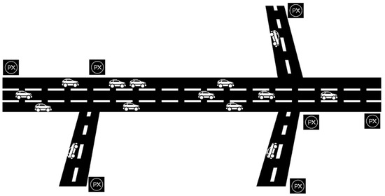 In order to control and dispatch autonomous vehicles safely and accurately over a whole network, we have to combine the controlling sections so that we build a virtual network of controlling sections that are connected to each other, and together, they reflect the actual road network. In this way, autonomous vehicles can be better tracked to perform straight driving, turning, changing lanes, and other driving behaviors. For example, the virtual turnout settings at the intersections in the hypothetical highways of Figure 4 can be represented by a total of four controlling sections, with seven service areas (that, based on our previous convention, we consider as “rail stations” and dispatching nodes in our virtual track network). Interval allocation (controlling cells) and node processing are performed on this highway simplified network as described earlier and is shown diagrammatically in Figure 5.