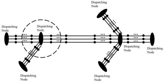 The scheduling or dispatching nodes play the role of the (rail) stations and are usually taken to coincide with the highway service areas that are distributed at unequal intervals on the highway network. These play the role of hubs and traffic flow nodes similar to the train stations in a railway system. Therefore, node processing for the virtual track transformation is performed on the highway based on the service area locations.