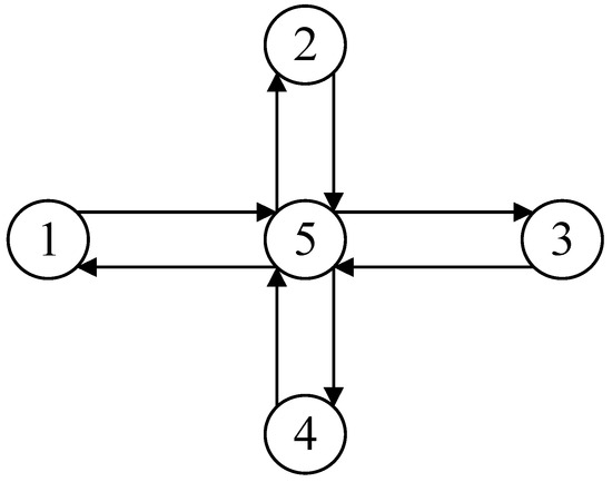 The SIMLite software V2.0 developed by Zhou et al. on the basis of DTALite [28] and C# programming were used to verify the model. SIMLite software adopts a macro–micro two-layer network structure, which can evaluate the traffic system from different angles and can be applied to the optimization of autonomous vehicle operation trajectories. This section first uses a road network test case containing 5 nodes and 8 direction sections for testing. The sample graph of the macro-level test road network and the schematic diagram of virtual-tracked micro-level road network are shown in Figure 7 and Figure 8, respectively.