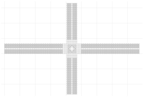After virtual tracking, as shown in Figure 8, the road network has a total of 1064 nodes (like those numbered A1, A2, etc., in Figure 2) and 2500 intervals (controlling cells). However, this road network after converted to virtual track may have local connection interruptions, which will lead to errors in the final solution results or cause a situation where some vehicles have no feasible paths. Therefore, the SIMLite software is first used to verify the connectivity of the virtual tracked road network. To do this, we provide a set of simple initial OD matrices and road network data files, then run the SIMLite software to perform a road network traffic distribution and analyze the traffic distribution results to check whether the connectivity of the road network is intact.