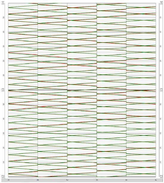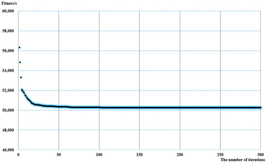 Figure 10 and Figure 11 show the results from the running of the model and the optimization process. Figure 10 shows the temporal-spatial trajectory diagram before and after optimization in a similar way in which we construct these diagrams for the railway tracks. The spatio-temporal trajectories are optimized and solved through the SIMlite software and C# programming. In Figure 10, the temporal-spatial trajectory diagram before optimization is shown in red, and the temporal-spatial trajectory diagram after optimization is shown in green. In order to optimize the function of the algorithm and improve the solution speed, the particle swarm optimization (PSO) method, which was proposed by Kennedy and Eberhart in 1995 [72], was also used.