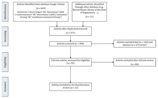 The first step in the review process resulted in 675 articles. After articles were identified in other libraries or databases, 304 duplicates were removed. After analyzing titles and abstracts, only articles related to studies investigating countermeasures in CAD were included in the review. This led to the further exclusion of 209 articles. After reviewing the remaining 95 articles, 84 articles were excluded due to a lack of relevance to this review. These articles mainly did not focus on countermeasures in CAD, but on manual driving. Schneider et al. [34], for example, investigated the effects of a seat-integrated mobilization system on passive fatigue, Bier et al. [24] focused on the effects of driving games, and Wang et al. [35] explored a haptic guidance steering system. Although these studies showed effective opportunities to prevent driver fatigue, they are not wholly applicable in CAD.