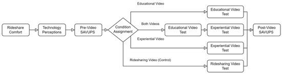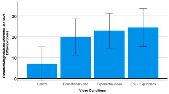 Attitudes toward advanced vehicle technologies might be improved by increasing exposure and, thus, familiarity with them. Previous research has shown that first-hand experience with AVs can increase trust, which influences intent-to-use [27,28]. Because first-hand experience is difficult to make available to a wide audience at this point in the technology’s development, as well as persistent pandemic conditions (their study’s data collection was interrupted), we aim to look at whether and what types of online videos (educational or experiential) would be effective in influencing potential user’s attitudes toward SAVs.