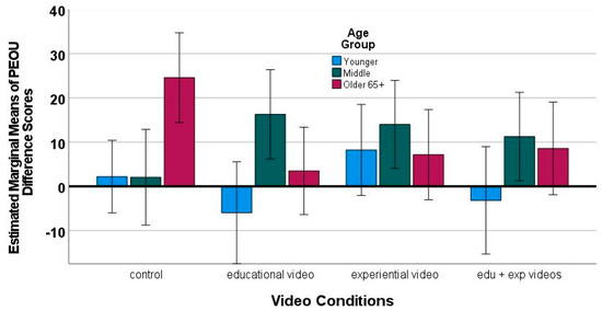 Observed between-subjects tests video condition by age group interaction on perceived ease of use. NOTE: Error bars are 95% CIs.