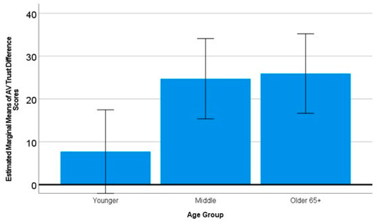 For differences between age groups, multivariate testing showed that older adults had greater improvements in their attitudes towards SAVs than younger respondents, with Pillai’s Trace of 0.078, F(10, 830) = 3.39, p < 0.0001, ηp2 = 0.039. Tests of between-subjects effects showed that older adults’ trust toward AVs increased significantly more than younger adults (F(2, 418) = 4.09, p < 0.018, ηp2 = 0.019; see Figure 8). Older adults also increased significantly more in PU of SAVs than younger adults (F(2, 418) = 5.94, p < 0.004, ηp2 = 0.28; see Figure 9), as well as PEOU increasing more for older adults than either middle-aged or younger adults (F(2, 418) = 4.64, p < 0.02, ηp2 = 0.022; see Figure 10) after watching their randomly assigned video(s).
