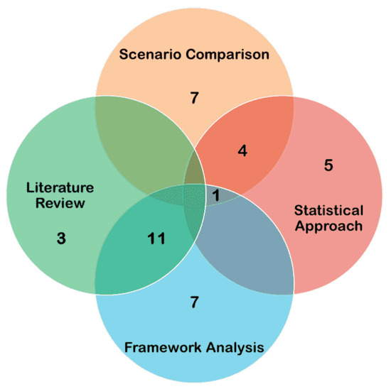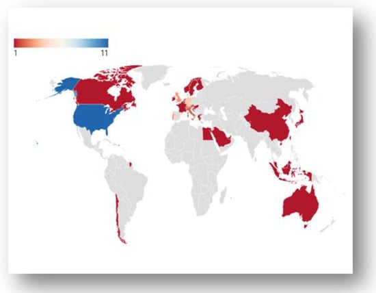A geographical coverage map was drawn to present the distribution of the 41 articles across the globe (Figure 3). Articles were found in 31 countries and across 4 continents, which are as follows: 22 from Europe (Spain, Germany, Greece, Portugal, Switzerland, France, UK, Belgium, Hungary, Italy, Greece, Croatia, Netherlands, Austria, Sweden, Norway, Finland, Ireland), 10 from America (USA, Chili, Canada), 7 from Asia (UAE, KSA, Taiwan, China, Malaysia, Indonesia, Japan), 1 from Africa (Egypt), and 1 from Oceania (Australia).