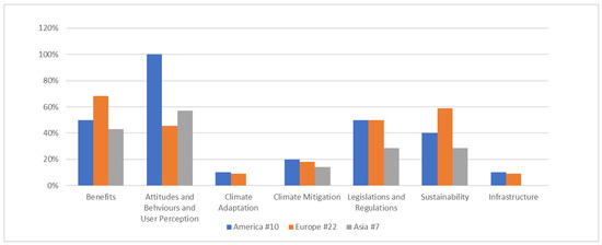 Figure 4 illustrates the distribution of each category based on different regions. As illustrated in Figure 4, benefits are some of the most prominent considered factors of the papers written in America, Europe, and Asia. The Europe region has considered all seven factors. Both Europe and America regions considered factors such as benefits and legislation and regulations and sustainability almost equally. However, Asia pays less attention to climate mitigation and adaptation compared to America and Europe. One could argue that the lower use of cars in comparison to developed countries might contribute to this situation [28]. To clarify, they might not fully recognize the changing climate, therefore resulting in a lack of proactive adaptation and mitigation measures. In addition, the Asia region did not consider infrastructure as a factor of investigation.