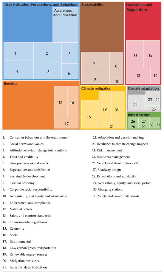 Upon conducting the systematic review, 41 articles were identified and selected in this review. Seven different themes and thirty-two sub-themes were obtained using a hybrid model which considered inductive and deductive approaches (selection process detailed in the above methodology). This methodology enables a comprehensive investigation of the present status of knowledge regarding AVs, including both newly discovered insights and those informed by pre-existing theoretical frameworks. The seven themes include: benefits, user attitudes, perception and behaviour, climate mitigation, legislation and regulations, sustainability, and infrastructure (Table 2). The sub-themes are shown in Figure 5. By highlighting particular aspects of each theme, these sub-themes provide the overall themes with more depth. This detailed approach guarantees a thorough examination that is attuned to the complex aspects of the selected themes. This section describes and discusses the current state of knowledge as related to these themes and sub-themes.