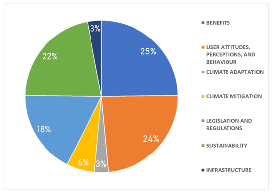 The target group of this review was primarily concerned with the subsets of urban areas. The main terms for the target group cluster were: “sustainability”, “climate mitigation”, “climate adaptation”, “legislation”, “attitudes and perception, and user behaviours”, “user benefits”, “legislations and regulations”, “Infrastructure”.