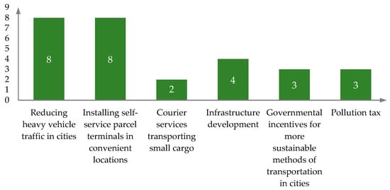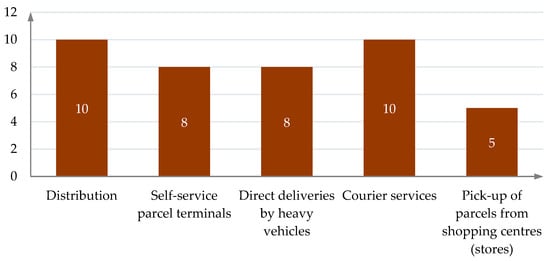 - The research conducted through the application of the expert survey method identified key factors related to improving urban sustainability and reducing environmental pollution and social impacts. The main and most commonly used modes of delivery of small goods were courier services and distribution. The security of people and that of personal information were identified as the key reasons for the relatively slow development of the transportation of small goods by UAVs. The research results also highlighted the advantages of UAVs in terms of their ability to reduce environmental pollution and their speed.