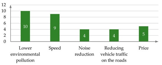 Environmental pollution. The transport sector is a rapidly growing sector with the highest greenhouse gas emissions [20]. Epidemiological studies have shown that air pollution contributes to a wide range of adverse human health effects, including respiratory and cardiovascular diseases [21]. Varying carbon dioxide emissions result in companies facing volatility in transport service prices [22]. Vehicles must comply with emission requirements, and companies are encouraged to purchase newer vehicles that are less polluting or to look for new technologies for the delivery of goods. The use of UAVs for the delivery of small parcels would help to reduce the number of freight vehicles on the roads and, at the same time, air pollution in the cities.
