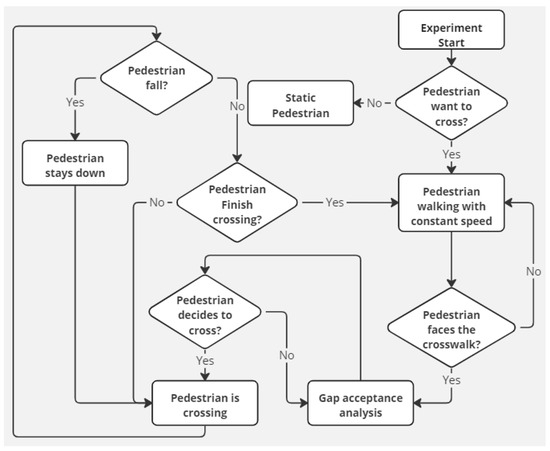 Based on this perception of the environment, our focus is on the interaction of an AV with a highly vulnerable road user, the pedestrian, during a pedestrian crossing. The pedestrian is a complex agent with which to cooperate. It is difficult to predict its trajectory due to the great uncertainty in its actions [3]: the pedestrian agent may change its mind and therefore its objective, or it may fall or have a perception that puts it in danger. Thus, it is very important to comply with the legislation of the country in question, as pedestrians have priority over vehicles in many Western countries. In the event of a pedestrian–vehicle encounter, the AV must decide on the order of passage of the agents at the meeting point (such as crossing paths at a pedestrian crossing) and act accordingly.
