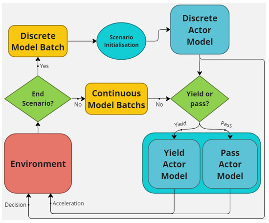 The use of the PPO structures our algorithm in two parts: a loop between the generation of batches on the environment with the current models, and a learning process on the same models based on the obtained batches. Batch generation is shown in Figure 2. At the start of the scenario, the discrete model is applied to each vehicle. We have a trajectory plan for each vehicle, which enables us to select the right continuous model to be applied throughout the scenario. The results obtained throughout the scenario (state, action, reward and log probability) are stored in a batch according to the decision taken by the discrete actor (our decision model). The discrete actor adds a line to its batch for each scenario (or new pedestrian); so, it needs enough scenarios per batch (maximum 80 steps per scenario). It sums up the errors obtained during the experiment. Each type of error incurs a penalty only once, rather than on a per-step basis. In this way, the vehicle will be penalized in the same way, regardless of how long the pedestrian has been endangered. It is important to remember that the input state of each model is modified to match the point of view of the vehicle in question. This modification process is described in detail in Section 3.2. For the learning part, we train the decision model on the different batches retrieved in the previous section. We can imagine a slower learning process for the discrete model due to having a much smaller batch size. The dependency between the continuous models and the discrete one is unique. On one hand, the discrete model chooses the data for the continuous part. On the other hand, the continuous part results will impact the discrete reward.