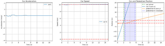 In the scenario where the car yields to the pedestrian (see Figure 4), the car speed profile consists of three stages. Firstly, the car reduces speed to give the pedestrian sufficient distance to cross. Secondly, the control model adjusts the speed to enable the car to leave as quickly as possible while maintaining a safe distance. When the pedestrian leaves the crossing zone completely, the car accelerates rapidly to reach the maximum speed. The car must adapt its speed according to unexpected events, such as a pedestrian falling on the road. In the example, the pedestrian has fallen, stopping his crossing for two seconds. The vehicle adapted by reducing speed and delaying its phase 2.