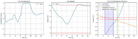 The three diagrams respectively illustrate the vehicle acceleration, vehicle speed and position of the two agents over time in a scenario where the pedestrian crosses first.