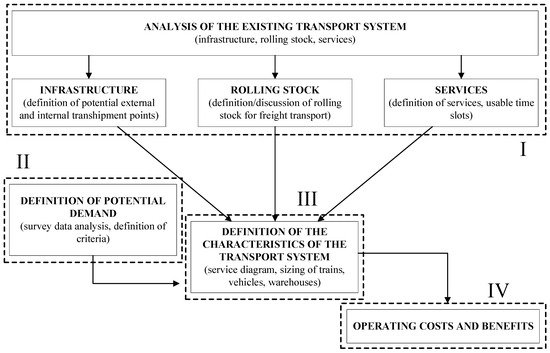 The first phase (I) is an analysis of the existing transport system. First, the infrastructure analysis is performed. This is the basis for understanding the existing transportation system. In order to limit the investment costs, the existing infrastructure has to be used and adapted for freight transport, including the identification of the potential external and internal transhipment points. Secondly, the used rolling stock has to be analysed. The designing of freight flow by railway must take into account the use of the existing rolling stock (passenger metro/tram/train through maintenance, renovate, etc.) or changing it for new freight rolling stock. Thirdly, the characteristics of the service for freight delivery need to be analysed. It is relevant to identify in which part of the supply chain the railways substitute road transport and if the service operates for e-parcel deliveries or for shop restocking.