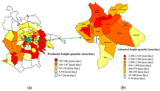 The O/D matrix has the origins of all the zones that have a quantity of freight to be delivered within the ZTL area of the municipality of Rome and, as destinations, all the zones of the historic centre to serve. Therefore, it allowed us to identify the zones as follows: origin is all areas in the administrative borders of the municipality of Rome (excluding ZTL; Figure 4a) and destination is all the municipalities that make up the ZTL zone (Figure 4b). Based on the results of the survey, the modelling framework was calibrated and applied to the case study. It emerges that the overall amount of all the deliveries made within the ZTL coming from the areas of the study area is 12,536.69 tons/day [50].
