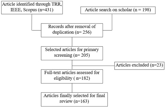 A rigorous manual screening process was then applied to refine the collection. Titles, abstracts, and authors’ details were reviewed and organized. This curation process led to the exclusion of 309 articles that were either duplicates or did not meet the stringent criteria of relevance. The remaining 163 articles underwent a phase of scrutiny in which each paper was assessed for its contribution to the expanding narrative of AV−pedestrian interactions (see Figure 1). The selected articles were critically reviewed to piece together a comprehensive story of technological evolution, human behavioral patterns, and the unfolding ethical and infrastructural landscape.