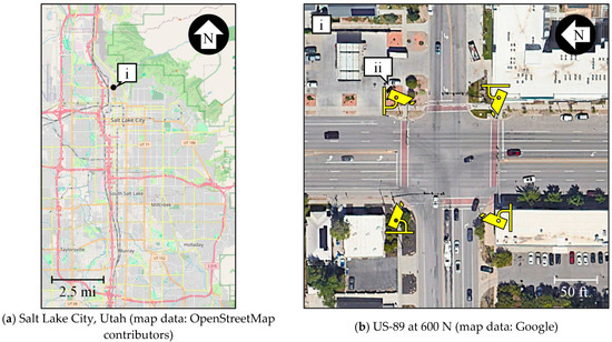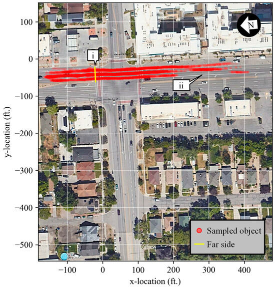 The LiDAR sensors installed at this location were implemented for testing purposes. The LiDAR sensor at the northeast corner (Figure 1b, callout ii) serves as the origin of the estimated object locations [30].