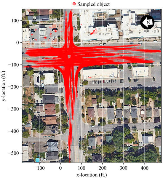 Figure 2 depicts all the sampled moving objects detected by the LiDAR sensors in Figure 1b during the analysis period. These data cannot be utilized in their raw state for estimating movement-level traffic signal performance measures. The following process was used to prepare and filter the data for the subsequent derivation of movement-level traffic signal performance measures: