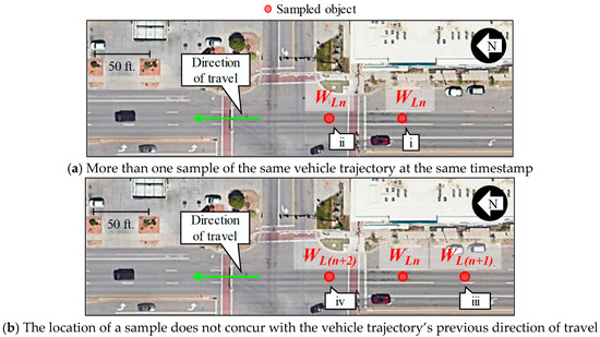 The second type of noise (Figure 3b) occurs when the waypoint sampled after the current timestamp n (i.e., n + 1, callout iii) is located opposite to the vehicle’s direction of travel (i.e., the n waypoint’s heading). Usually, the subsequent sample after the erroneous case (i.e., n + 2, callout iv) is congruously located in relation to the original direction of travel. In these scenarios, the sample that appeared in an unexpected location (in this case n + 1) needs to be discarded.