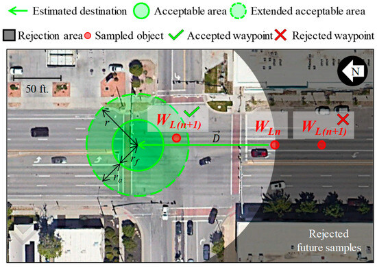 If no waypoint sampled at n + 1 is found within the acceptable area, discard them. Then, return to the first step to repeat the process, now comparing the waypoint sampled at n with the waypoints sampled at n + 1 + i, where i is a count of how many iterations have failed to update n.