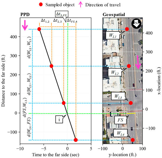 In a PPD, plotted trajectories pivot on the far side of the intersection (Figure 6, callout FS), which means that the time and space at which the vehicle is estimated to cross over this line is taken as the origin (Figure 6, callout i). The vertical axis represents the distance (ft.) from a sampled waypoint to the far side, where is the distance between points A and B. The horizontal axis represents the time needed (s) for a vehicle trajectory to reach the far side, where is the time difference between points B and A.