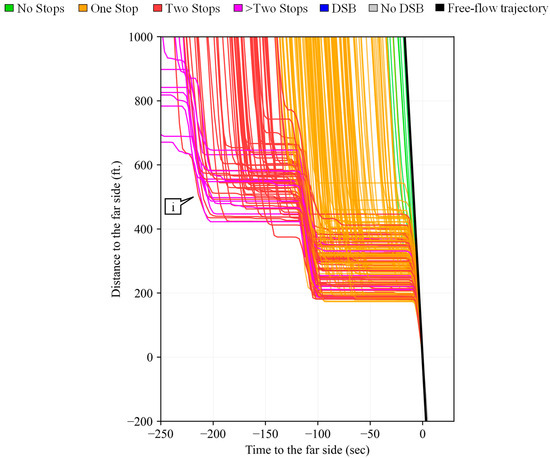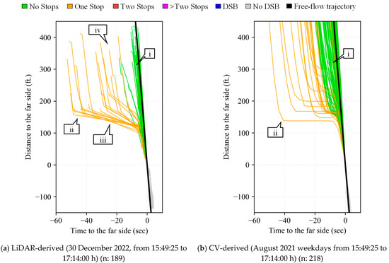 The one-stop trajectories in Figure 7a show a particular shape, where instead of presenting horizontal segments during the time that vehicles are stopped, diagonal segments are shown (callout iii). This occurs because the LiDAR dataset does not include any waypoint of vehicles traveling under 10 mph. Therefore, for each vehicle that stops, there is a data gap between when it slows down and when it speeds up over the 10 mph threshold. Due to this limitation, this study assumes that a vehicle trajectory stops if there is a data gap longer than 5 s between two consecutive waypoints where the necessary speed to travel between them is less than 5 mph.