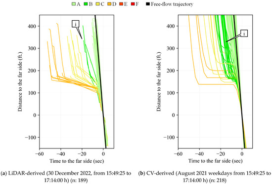 Figure 8 shows the same PPDs as Figure 7, but the trajectories are color-coded based on their estimated control delay LOS (Table 1). Table 3 provides a data source comparison of delay-focused performance estimations. Both PPDs are assigned an LOS A, and only an increase of 1.39 sec/veh in the weighted average control delay is estimated from the LiDAR data. This change is consistent with the 2% AADT increase that occurred during the LiDAR analysis period. The largest discrepancy is the percentage of vehicles assigned an LOS B (callout i).