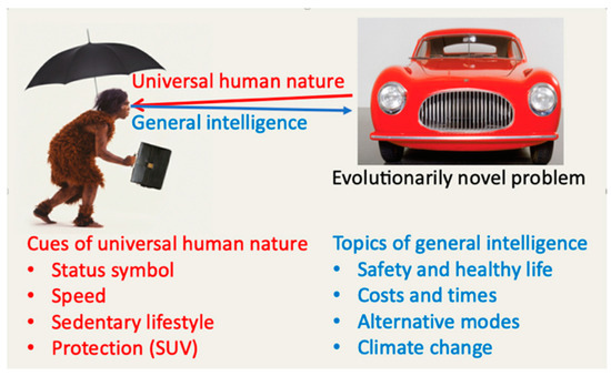 Automobiles have activated irresistible cues to our instincts. In Figure 2, the human being’s instincts are activated by four cues from the automobile, and his instinctive response is so immediate and natural as to compromise the use of his intelligence. A mismatch occurs if we use Kahneman’s System 1 thinking [20], “a near-instantaneous process driven by instincts, to evolutionarily novel problems (like the car) or, the reverse, when applying System 2 thinking, slower conscious and logical reasoning, to evolutionarily ancient problems [21]”.