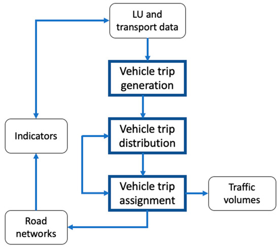 Since 1920, traffic planning has been based on quantitative mathematical models developed based on the theoretical and practical work of numerous traffic engineers. The primary focus was on speed and drivers’ travel times. A paradigm for the automobility city was based on “predict and provide” and a three-step traffic model (Figure 3) with a hydraulic approach to verify a sufficient capacity for the predicted traffic on the existing and planned roads [25]. Mode choice was absent, because the demand was divided between car users and transit passengers.