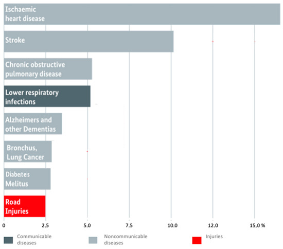 The effects of car pollution are widespread and affect ecosystems and human health. Some direct and indirect health impacts of cars are given in Figure 6. The list is not complete because there are also effects, including some of the most common cancers [26]. Road accidents are the result of problems with speed, road conditions, and human behavior with its physical and psychological limits.