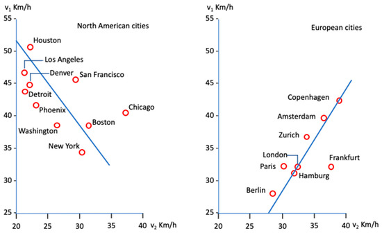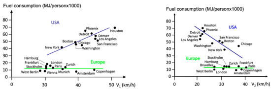 In Figure 10, v1 and v2 are negatively correlated in the US and positively correlated in Europe, which explains the differences in petrol consumption. In the US, car speed and consumption increase with the increase in car use and travel distances in areas of low density, high sprawl, and marginal transit use. Some cities, like New York, with a good supply of railways resisted the automotive vision. In Europe, the positive correlation of speed ensures competition between the two modes, to the point of keeping petrol consumption constant independently from speed; an important positive effect of transit.