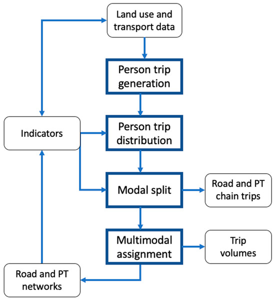 The model structure also changes to include multimodality. It should have new models for evaluating modal split and multimodal assignments, as shown in Figure 11.