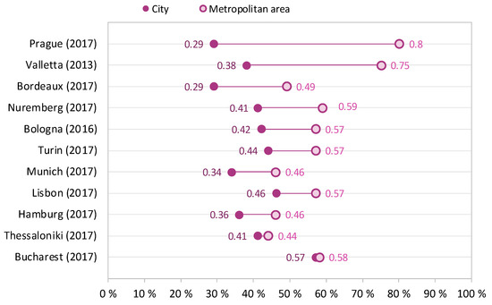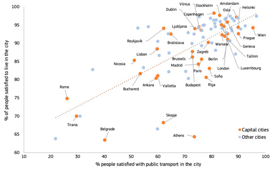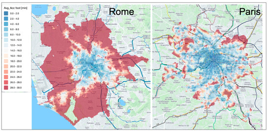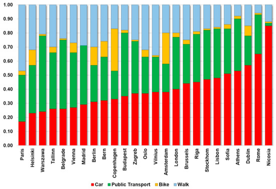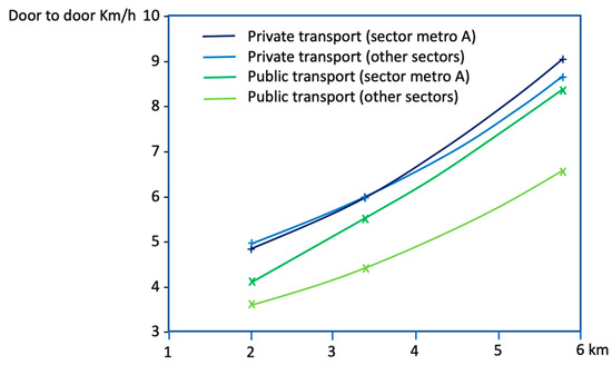 The distances travelled are not matched by the increase in speed v1, so the time dedicated to car travel increases to the detriment of travel via modes, especially walking, if the time budget is respected. Low-density cities, such as Houston, have higher car speeds, longer travel distances, and slower transit speeds. High-density cities, such as New York and Chicago, have slower car speeds, shorter travel distances, and higher transit speeds. They can increase proximity by shortening the distance between origins and destinations and can reduce car dependency in favor of AT [39,40].