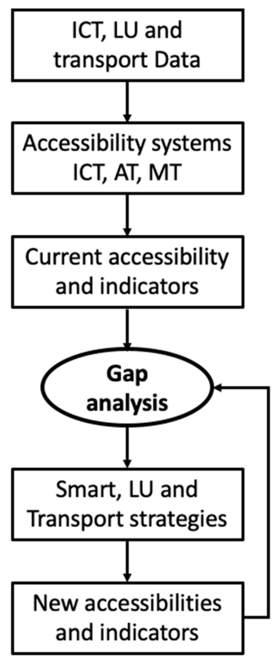 One of the first studies, 30 years ago, pointed to the necessity of a paradigm shift from automobility to accessibility planning [12]. The paper is focused on people and places rather than on mobility. Accessibility planning relies on more compact, pedestrian-oriented community designs, telecommunications, transport demand management (TDM), and public and active transport (PT, AT). Later studies proposed a new paradigm for sustainable mobility [5,7]. The main transport measures considered include reducing the need to travel through information communication technologies (ICT), such as online shopping; modal shift in favor of active transport (AT); land-use policy measures for distance reduction; and car technology innovations. In the face of a widely recognized increasing uncertainty, some scholars propose a triple access system based on AT for accessibility by proximity, multimodal motorized transport for more distant destinations, and ICT to be more adaptable in the face of change and adversity with policies and investments [13]. Their approach tries to manage the planning process in the uncertain future.