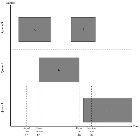 Equations (7a)–(7e) are denoted as “queuing constraints”. They prevent overlap both spatially and temporally, as shown in Figure 2. The x- and y-axis of Figure 2 represent time and space, respectively. Along the y-axis, the dashed lines represent discrete queuing locations. The shaded rectangles represent schedules BEBs to be charged. The vertical position of each shaded rectangle represents the BEB’s assigned queue. The width of the shaded rectangles represent the time to service the BEB. The vertical dashed lines are associated with vessel D and represent the arrival time, initial charge time, charge completion time, and departure time. Note that the arrival time may be before the initial charge time and the completion time may before the departure time. In other words, the set of constraints Equations (7a)–(7e) aim to ensure that these shaded rectangles never overlap.