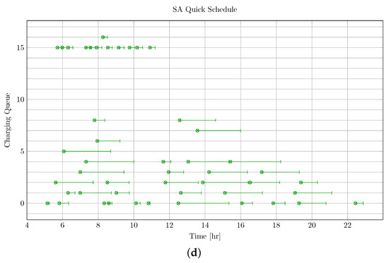 As suggested by the works in [35,36], applying heuristics to the generating functions can manipulate the searched neighborhoods in a way that may assist the SA algorithm with convergence. As a test to assist in minimizing charger utilization, a simple heuristic is applied to Algorithms 1 and 3 in the method such that they select new charging queues. Rather than selecting a queue at random from , the algorithm randomly selects whether to place a BEB in a slow or fast charging queue with a weighted distribution favoring slow chargers. Once the charger type has been selected, the algorithm will then begin incrementally attempting to place the BEB in a queue of that type beginning from the smallest index of that charger type. For example, if a BEB has been selected to be placed in a queue with a slow charger, the algorithm begins by attempting to place the BEB in the charger queue . If it is unable to be placed in that queue, it then attempts to be placed in the next queue . This is performed incrementally until all the queues have been exhausted. The objective of this alternative approach is to explore whether the added up-front computation cost by including the heuristic will positively influence the output of the results and to what degree.
