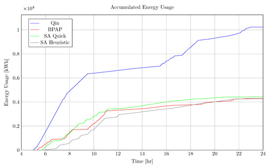 Total accumulated energy consumed by the Qin-Modified, BPAP, quick, and heuristic SA schedules throughout the time horizon.
