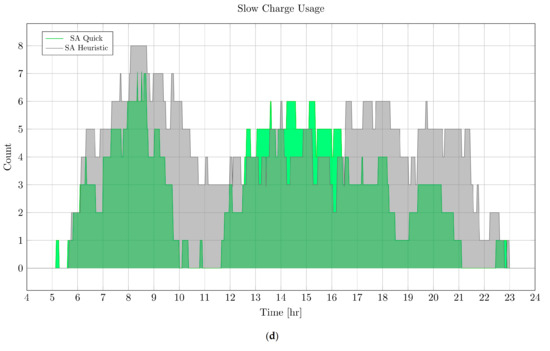 The charger utilization over the time horizon for each method is shown in Figure 6. Figure 6a shows that the Qin and BPAP employed between one and two fast chargers during the first eleven hours of the working day. The Qin heavily utilizes two fast chargers between hours five and eight to charge all the BEBs above the low threshold. Once the BEBs rose above the low threshold, both the Qin and BPAP utilized the fast chargers more sparingly throughout the working day. However, the difference between the BPAP and the Qin use of the fast chargers is that the BPAP is able to utilize the fast chargers only when required, such as when a long route is on the horizon and the BEB requires a higher initial SOC for visit i (as seen with the Qin SOC reaching 0%). A similar result for both the quick and heuristic SA technique can be seen in Figure 6b; however, both SA methods only require one fast charger, albeit more frequently than the BPAP. After the twelfth hour, neither quick nor heuristic SA methods require the use of fast chargers. This observation is predominantly due to the addition of the demand cost and the fact that it is applied throughout the entire working day. This becomes more clear when viewed in reference to Figure 6c,d. Comparing the slow charger use of the BPAP and Qin versus the quick and heuristic SA methods demonstrates that the charging completed by the fast chargers for the BPAP and Qin was heavily subsidized by slow chargers in the quick and heuristic SA techniques. The SA techniques, however, were still able to detect future demands and offset BEBs to the fast charger only when required. This effectively allowed the consumption costs to be reduced so that the SA techniques remained competitive with the BPAP (Figure 5), but the included demand cost allowed both SA methods to perform better than the BPAP with regard to peak demand (Figure 4).