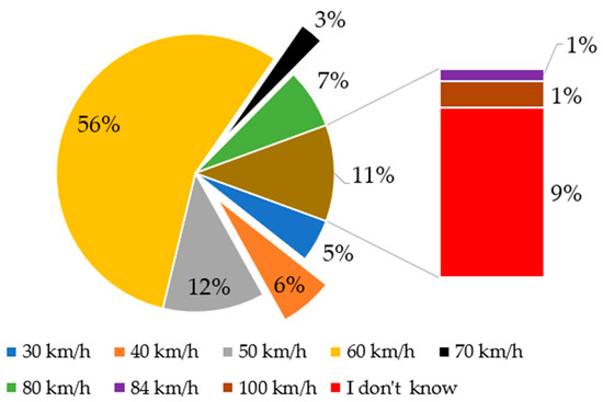 Among the most common behaviors are speeding (67%) and failing to stop at traffic lights (62%). Both of these behaviors are carried out with considerable frequency. Specifically, 32% and 27% of respondents, respectively, reported exceeding the speed limit and breaking traffic lights quite often. An investigation into the level of knowledge of speed limits on Yaoundé’s roads revealed that 9% of collective taxi drivers had no idea of the maximum speed limit in built-up areas in Cameroon, and, according to 12% of drivers, the speed limit was between 70 and 100 km/h (see Figure 1) (3% for 70 km/h, 7% for 80 km/h, 1% for 84 km/h and 1% for 100 km/h as presented in Figure 1). Details of these results are summarized in Table 7.