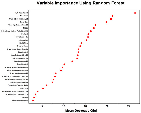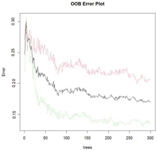 The variables mentioned earlier were used in the development of the RF model. An analysis was conducted to assess the model’s effectiveness by observing the evolution of OOB errors in relation to the number of trees generated (ntree). The OOB errors and their variations are visually depicted in Figure 2. The red classification curve illustrates the OOB error that occurred when crashes involving minor or no injuries were misclassified, while the green classification curve depicts the OOB error for crashes involving fatal or severe injuries. The black-colored curve represents the average progression of both OOB errors for the RF model.
