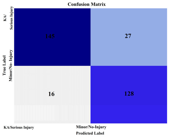 The validation procedure predicted the model’s outcome for micro-mobility crash-related injuries using the validation set. To evaluate the model’s performance, a confusion matrix and Receiver Operating Characteristic (ROC) curve were generated based on these predictions. Figure 3 depicts the confusion matrix. The RF model’s classification errors are indicated by values outside the diagonal, while the correctly classified data are represented along the diagonal. The model’s validation data indicates a significant level of predictive accuracy, 86.4%. In addition, the confusion matrix in Figure 3 suggests that the classification errors are marginally lower for micro-mobility crashes that result in fatal or severe injuries than those that result in minor or no injuries.