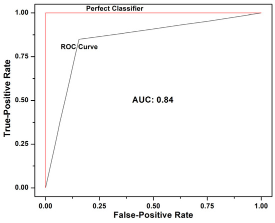 The ROC curve was implemented to evaluate the model’s performance further. It illustrated the RF model’s specificity and sensitivity (false positive rate and true positive rate, respectively). Equations (3) and (4) represent these values, as illustrated in Figure 4. The AUC is a metric used to approximate the model’s classification capability [41].