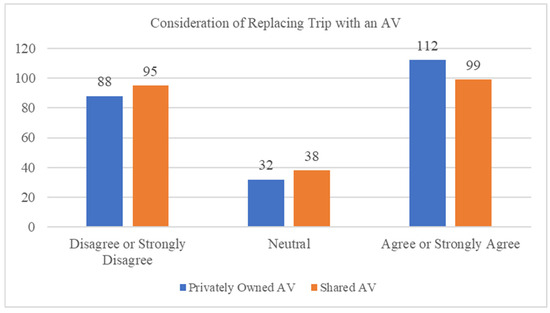 The mean of the response of willingness to replace the trip made to the study site with a privately owned and then a shared AV indicates there is slightly more interest in using them than not; however, the frequency distribution shows strong bifurcation in that stated interest. Figure 1 shows that 38% of the 232 respondents disagreed and 48% of the respondents agreed with the idea of using an AV they owned, while 41% of respondents agreed and 43% disagreed with the idea of using a shared AV.