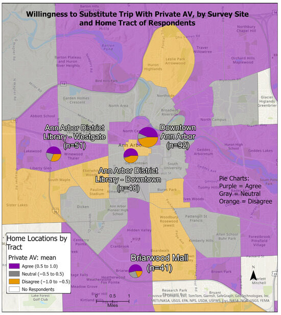 Across all four locations, no more than half of respondents expressed disagreement that they would be willing to substitute their current trip with a private AV (Figure 2). Interestingly, at both the Briarwood Mall and Downtown Library locations, the majority of respondents were willing to substitute their trips with a private AV, but not in Downtown Ann Arbor or at the western library location. That this was observed at one location on the urban edge and another in the center of the city in each case contrasts with our expectation that the automobile-friendly outer locations would see support for private AV use while the downtown locations would not.