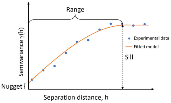 where is an observed value at a particular location, and is the number of pairs at a distance apart. is the experimental semivariogram, and is the lag distance. Prior to incorporating semivariogram parameters into the kriging estimation process, it is necessary to determine the most appropriate theoretical model that best represents the experimental semivariogram [11]. Kriging is a geostatistical interpolation technique that estimates unknown values at unsampled locations using the weighted averages of surrounding measurements, which are assigned based on the semivariogram model. A basic kriging estimation is defined as follows: