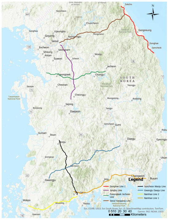 The study area consists of eight highways in South Korea: Jungbu line, Gwangju Daegu line, Seoul Yangyang line, Suncheon Wanju line, Namehae line 1, Namhae line 2, Donghae line 1, and Pyeongtaek Jecheon line. The study highways, ranging from 100 km to 200 km in length, encompass topographically distinctive regions in South Korea, such as mountains, lowlands, and coastlines. The diverse array of topography also covers varying weather conditions across the study area. These roadlines currently do not have any RWIS stations installed, so to inform their eventual placements, weather and road surface data were collected using mobile RWIS along the roadways. Data collection occurred on various nights between November 2022 and January 2023, when the temperatures did not change vastly over the data collection period, ignoring the temporal variability in weather conditions induced during the daytime. Figure 4 presents a map of South Korea, highlighting the eight study highways.