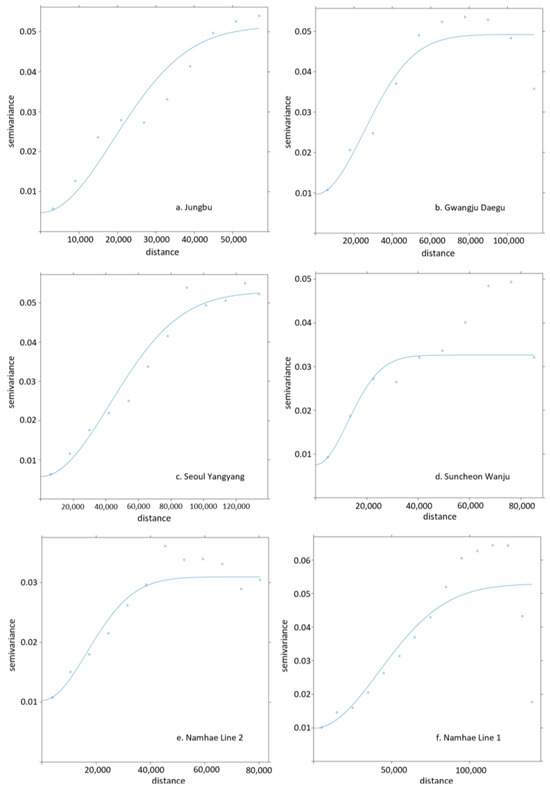 As Donghae Line 1 and Pyeongtaek Jecheon have a range longer than 50% of the road length, they are not used for the RWIS location optimization stage. The semivariograms of all six highways are shown in Figure 5.