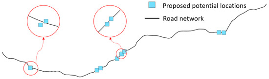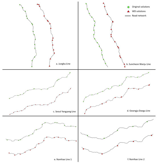 Therefore, two sets of preferred locations were generated for each highway. The solutions for scenario 1 were termed “original solutions”, and those for scenario 2 were termed “WD solutions”. The preferred solutions derived from this process are presented in Figure 7.